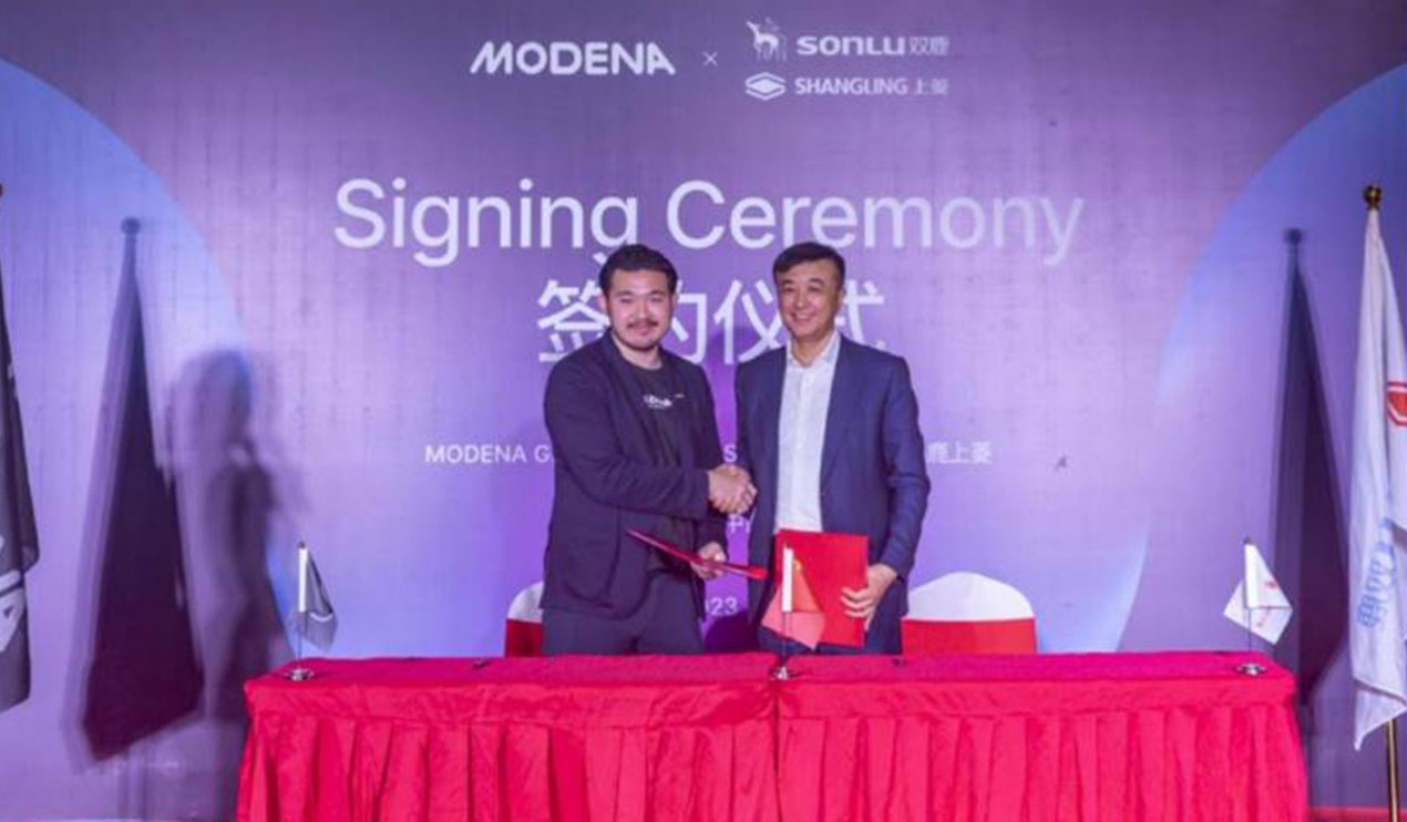 2023年4月22日,在江苏新沂智能制造基地,全球品牌 MODENA 与中国制造企业双鹿上菱签署了阶段性合资公司的备忘录。Modena 全球执行副总裁 Michael Jizhar、Modena 中国区董事总经理彭北平、Modena 全球战略副总裁 Erwin Vernatha、双鹿上菱集团董事长陈泉苗、双鹿上菱集团海外事业部总经理孙樵等双方高层出席了这一重要时刻。